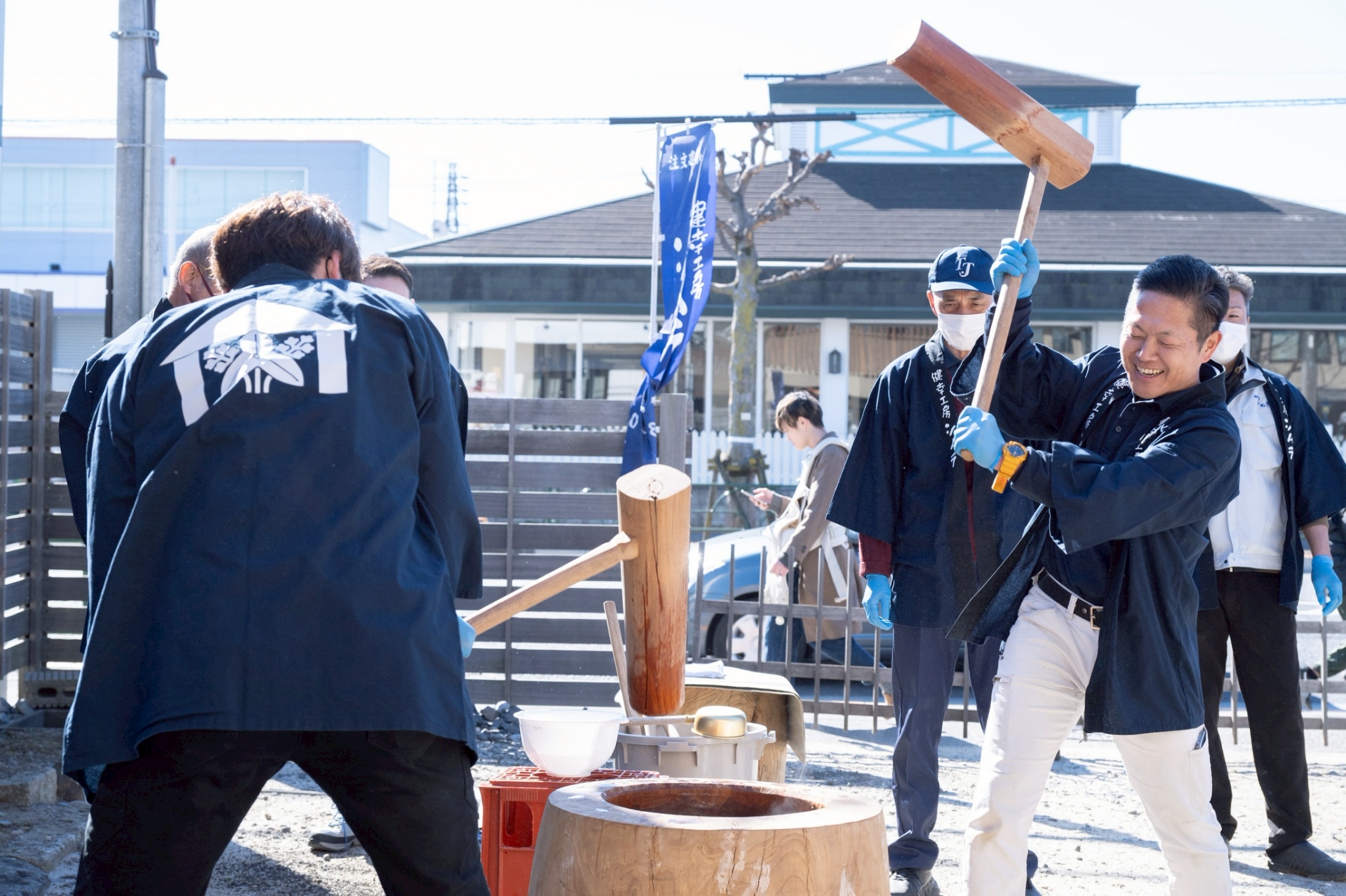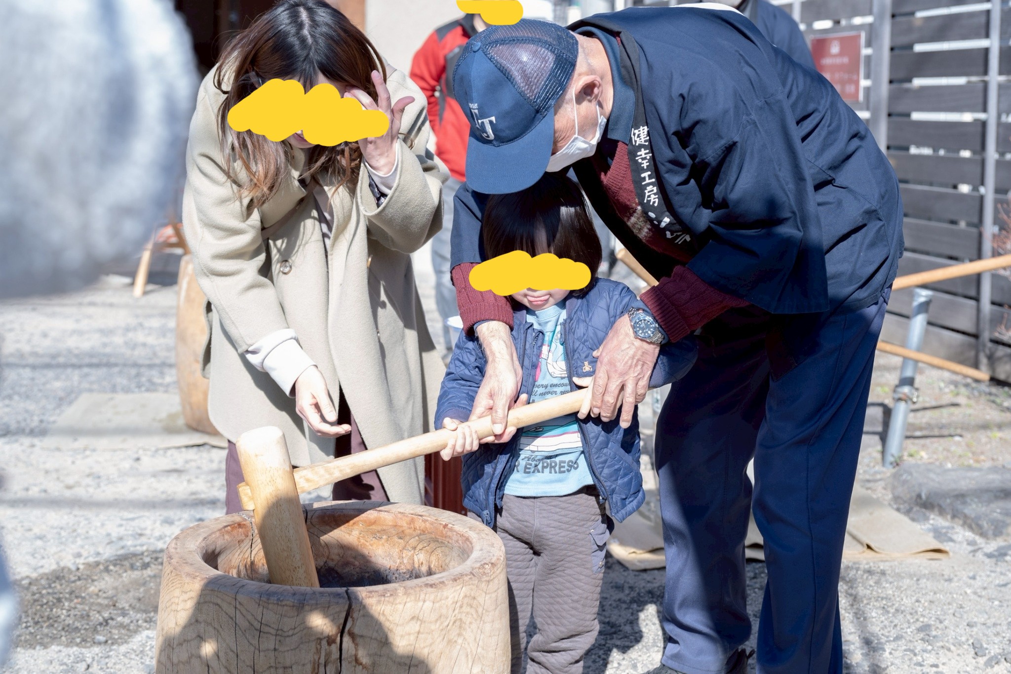 餅つき体験では、「よいしょ!!」という元気な掛け声のもと、