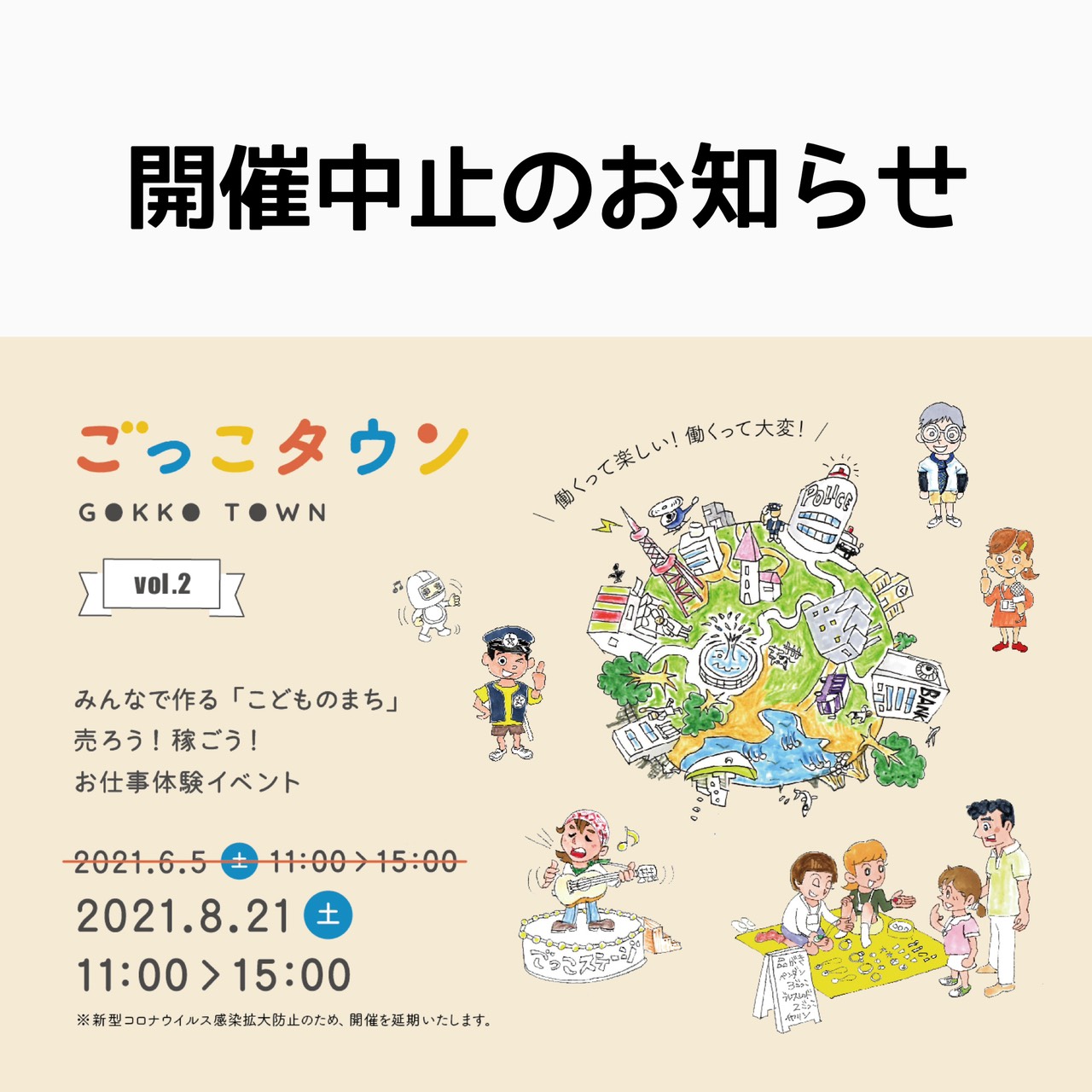 【8/21(土)ごっこタウン開催中止のお知らせ】