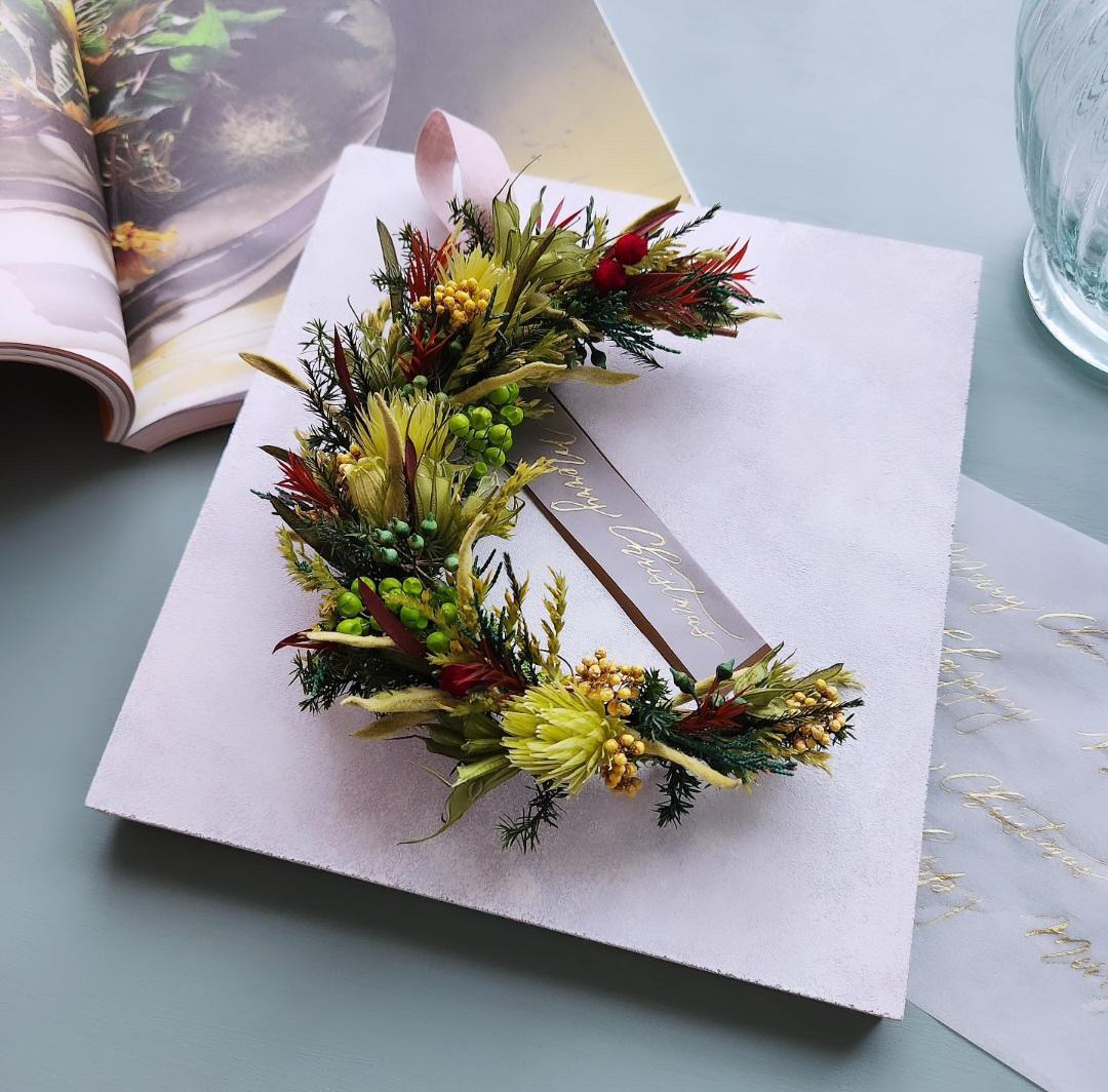「空間を素敵に彩る色合わせのリース」をテーマにプリザーブドフラワーを使用したクリスマスリースを