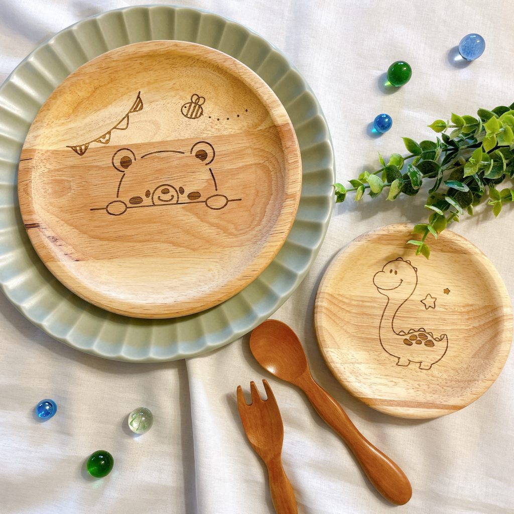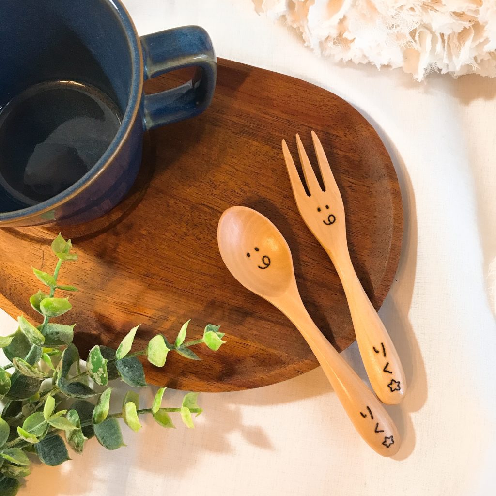 木製カトラリーや食器にウッドバーニング技法でイラストやお名前を焼き付けています。