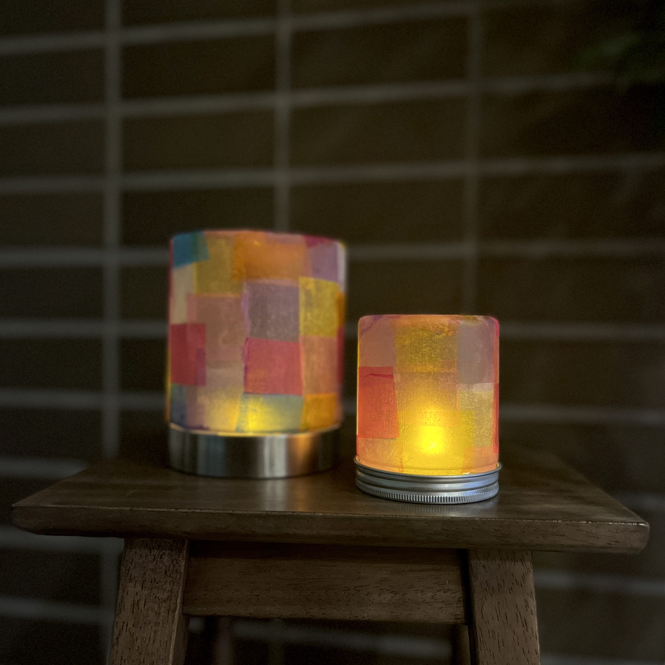お花紙を貼り付けてモザイクランタンを大小2つ作ります。