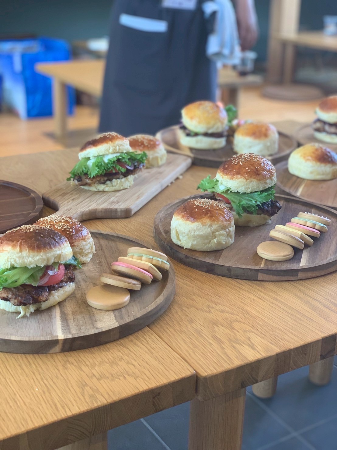 完成したハンバーガーとアイシングクッキーをオシャレな木のお皿に並べて完成です😊