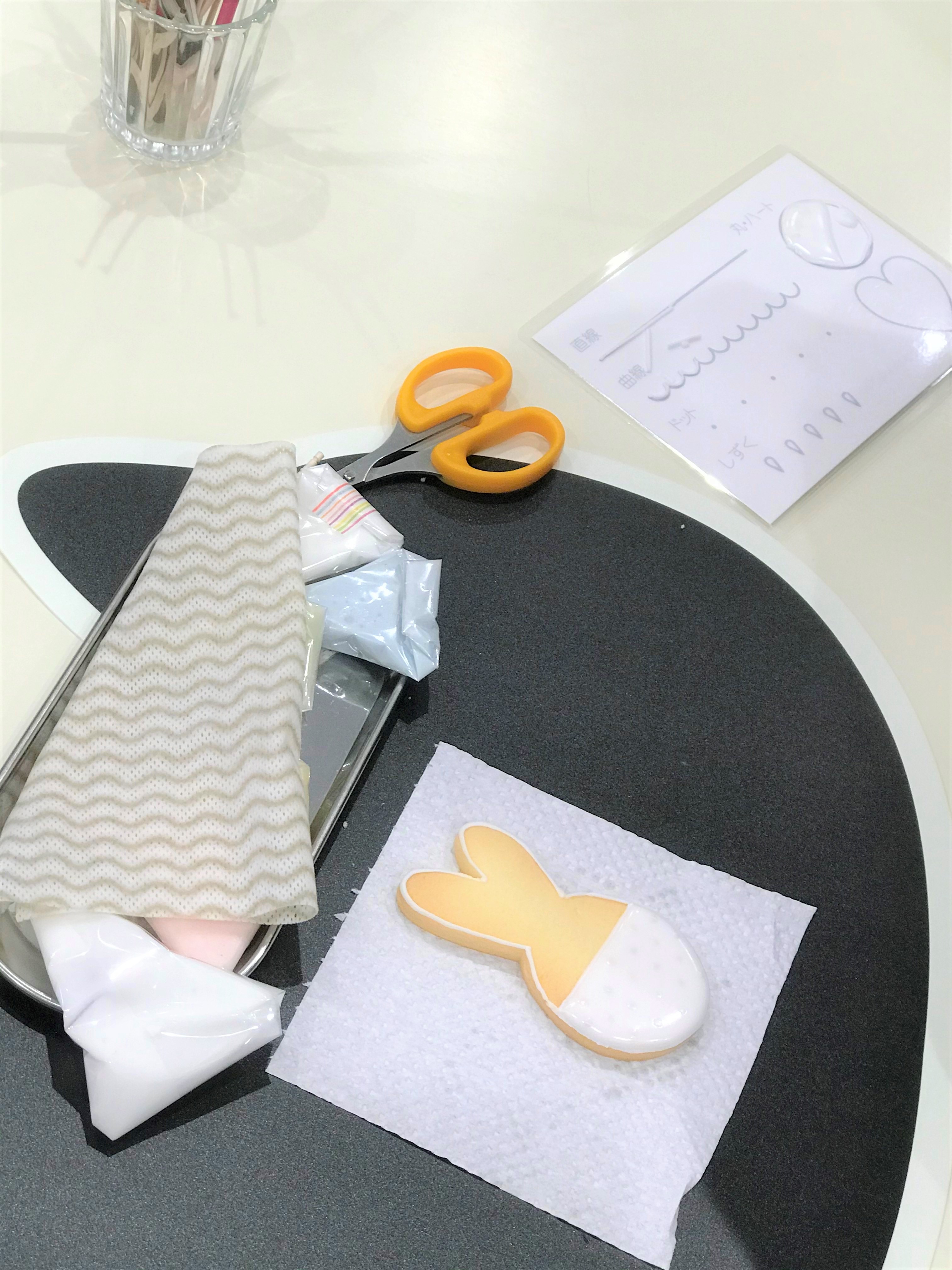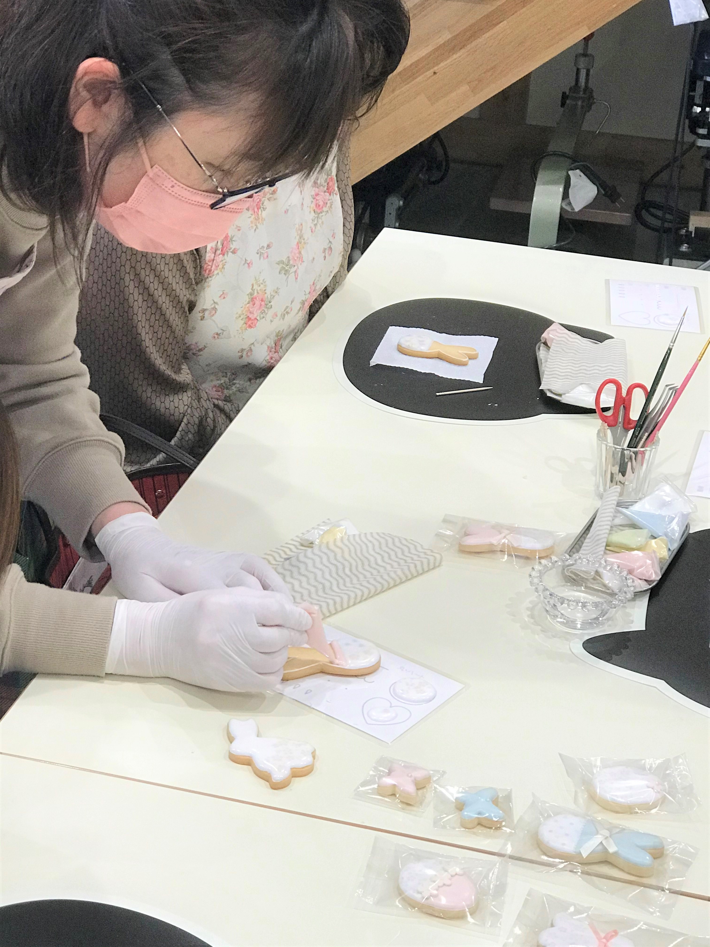 予めご用意頂いたうさぎと卵の形のクッキーに、淡いカラーのアイシングクリームを丁寧に塗っていきます。