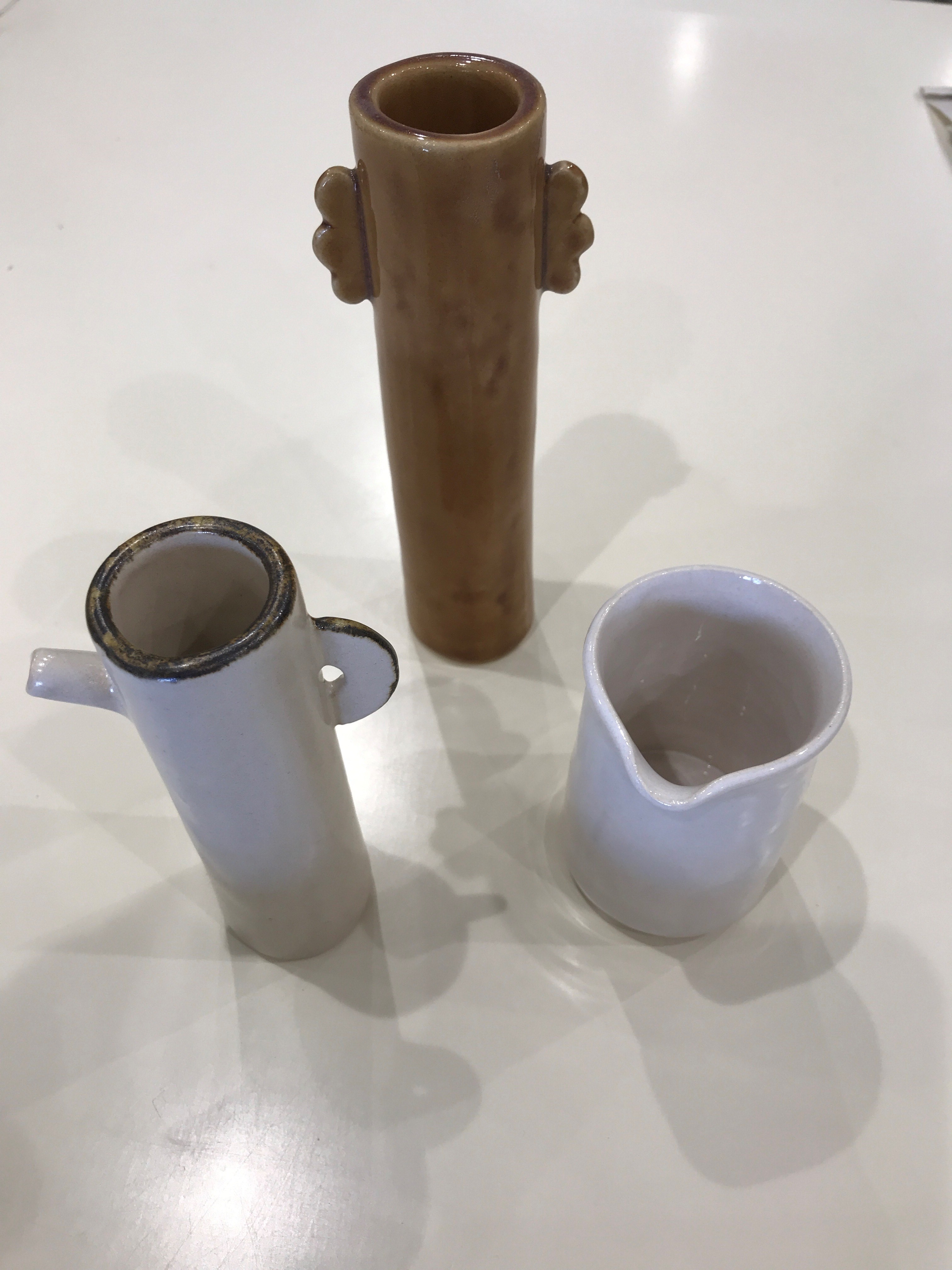 ひとつは筒状の型に粘土を巻き付けるように、一輪挿しの花瓶を作ります。