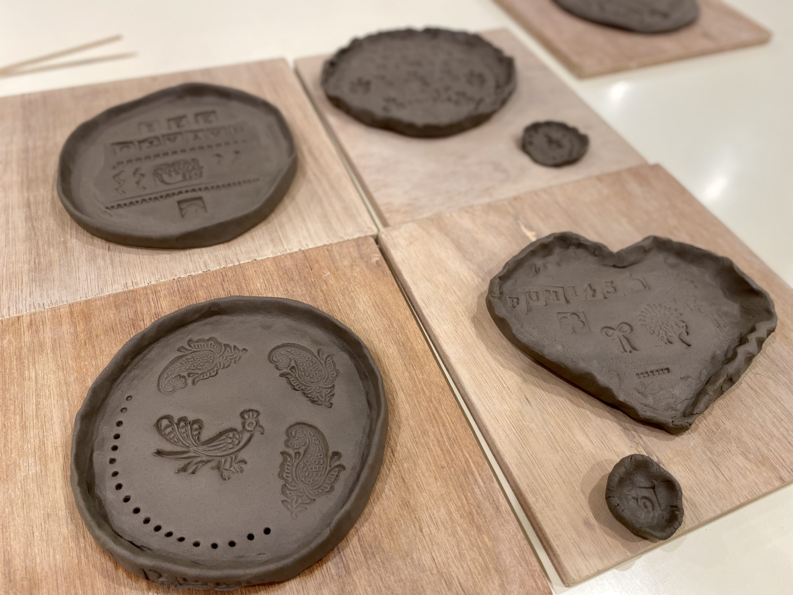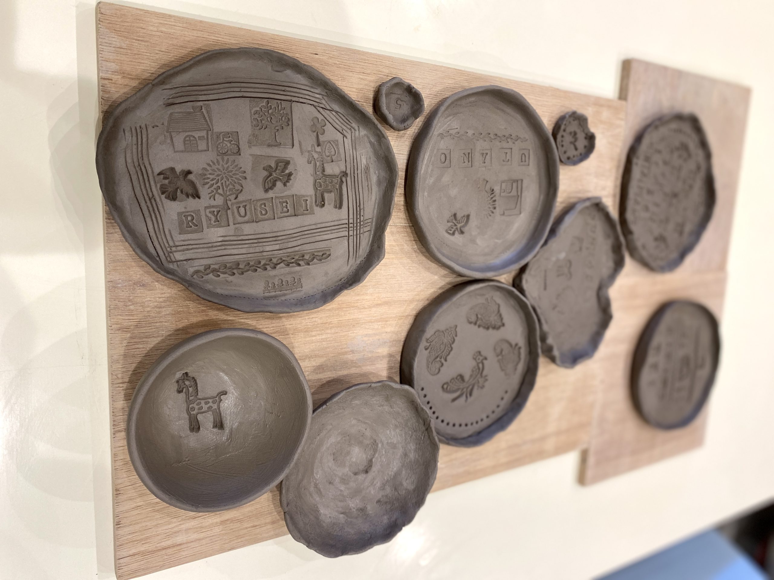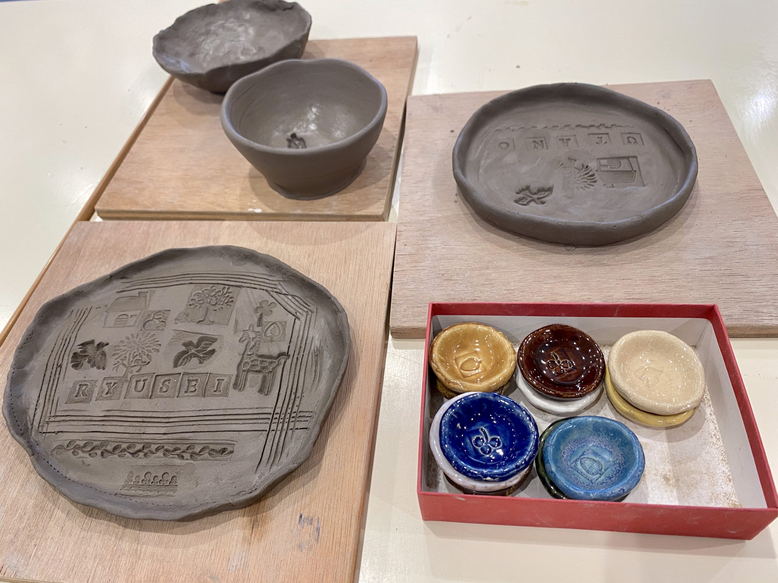 用意されている好きなスタンプを自由に押していただいて、希望の色の釉薬を決めていただいて一旦完成です!