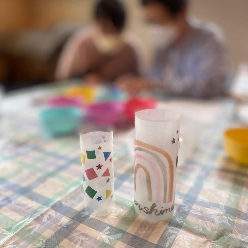 トレーシングペーパーに自由に絵を描き、保護のためにラミネートして作りました。