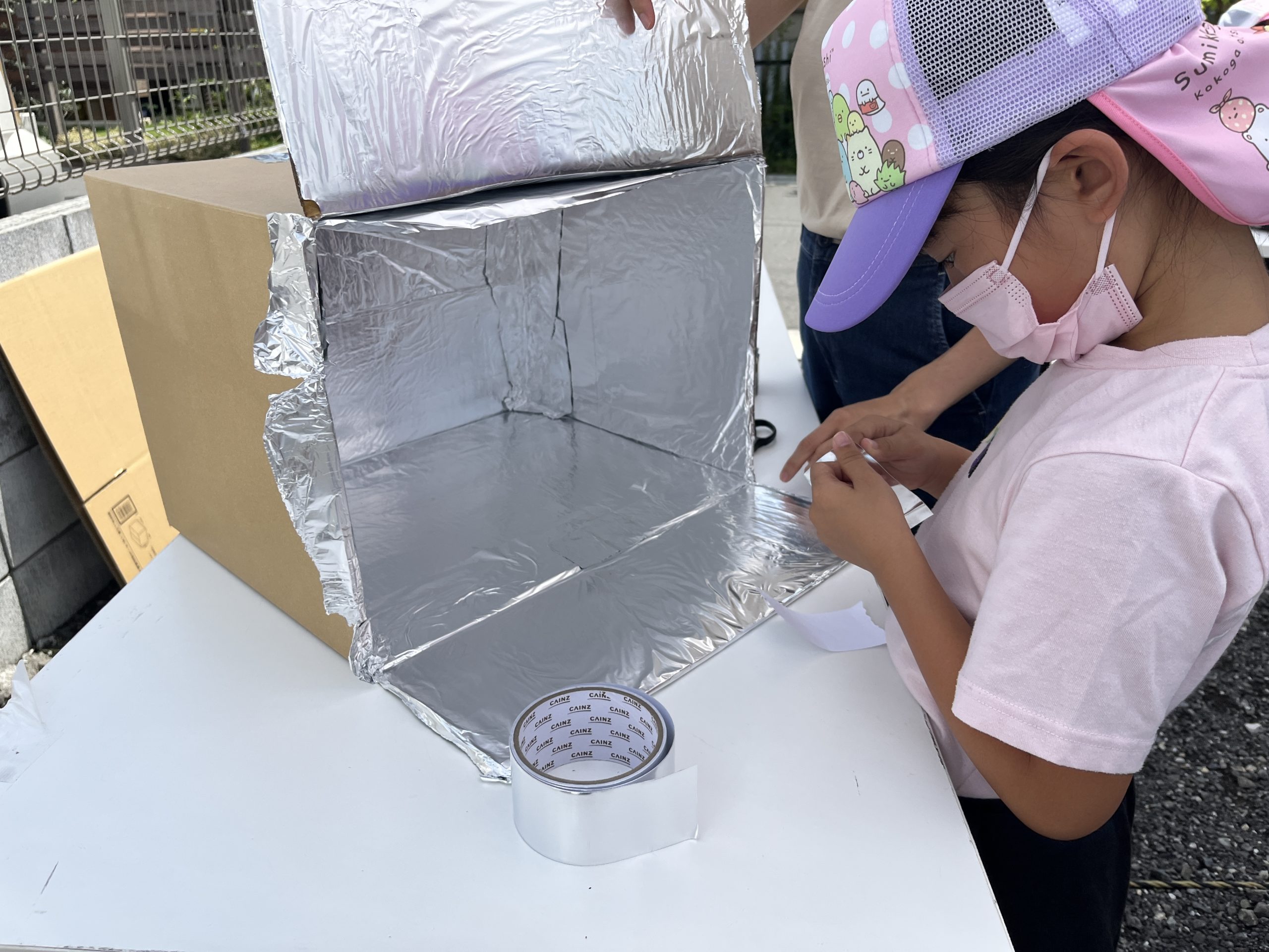 ピザ窯の内部になる部分をのりでアルミを貼っていきます。