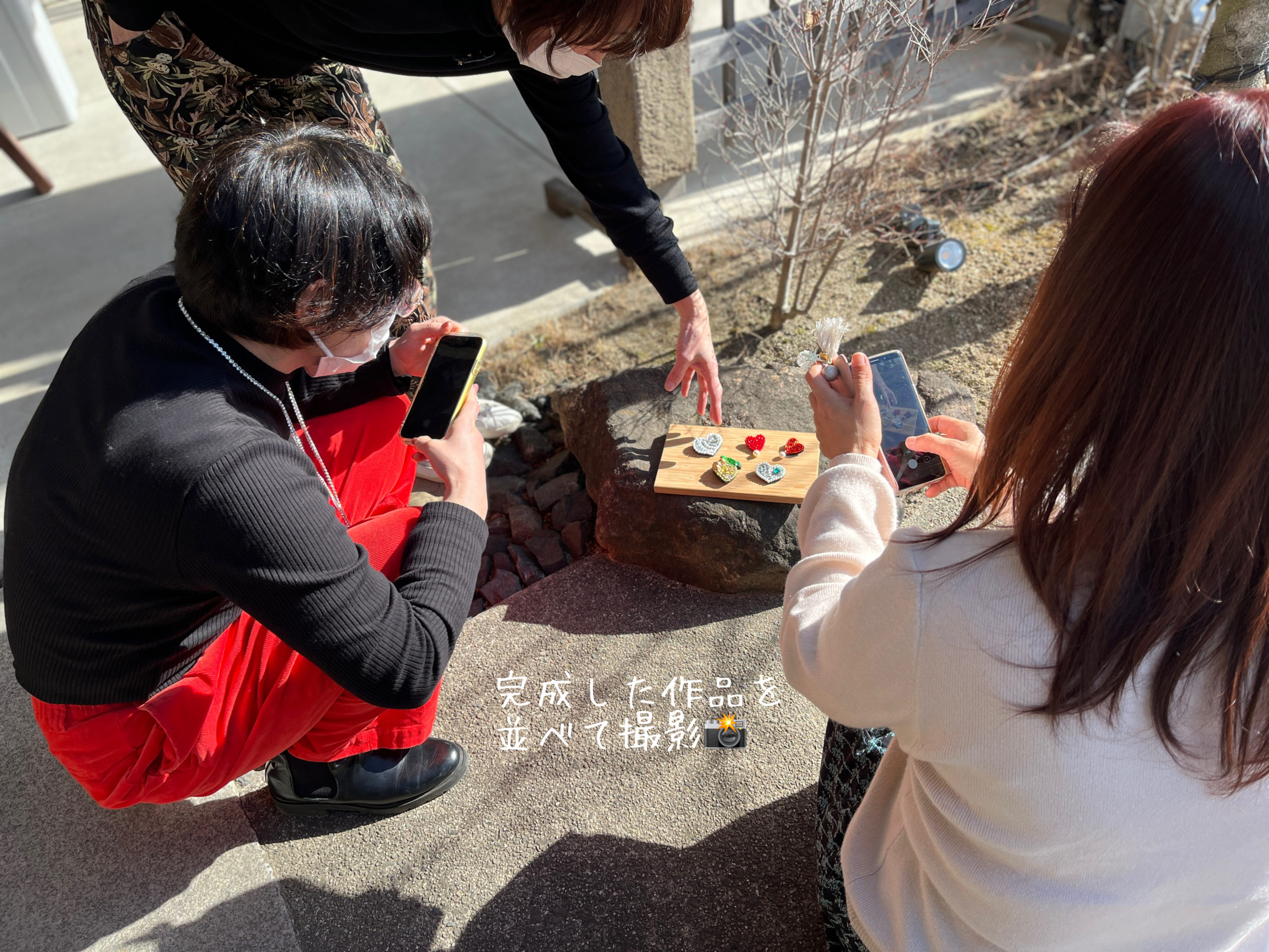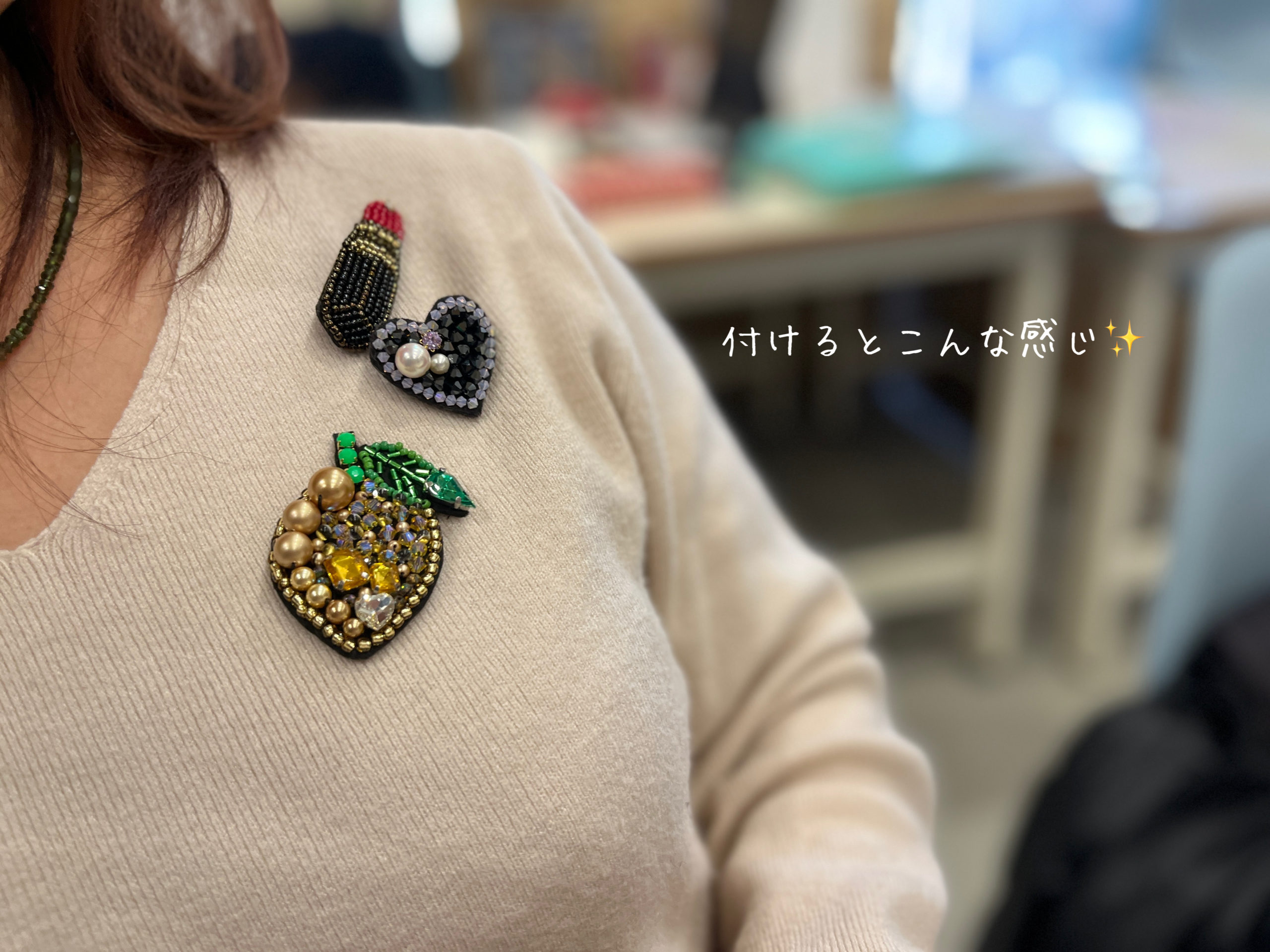 完成したブローチを早速洋服に合わせてみて素敵―✨と盛り上がっていました(*^-^*)