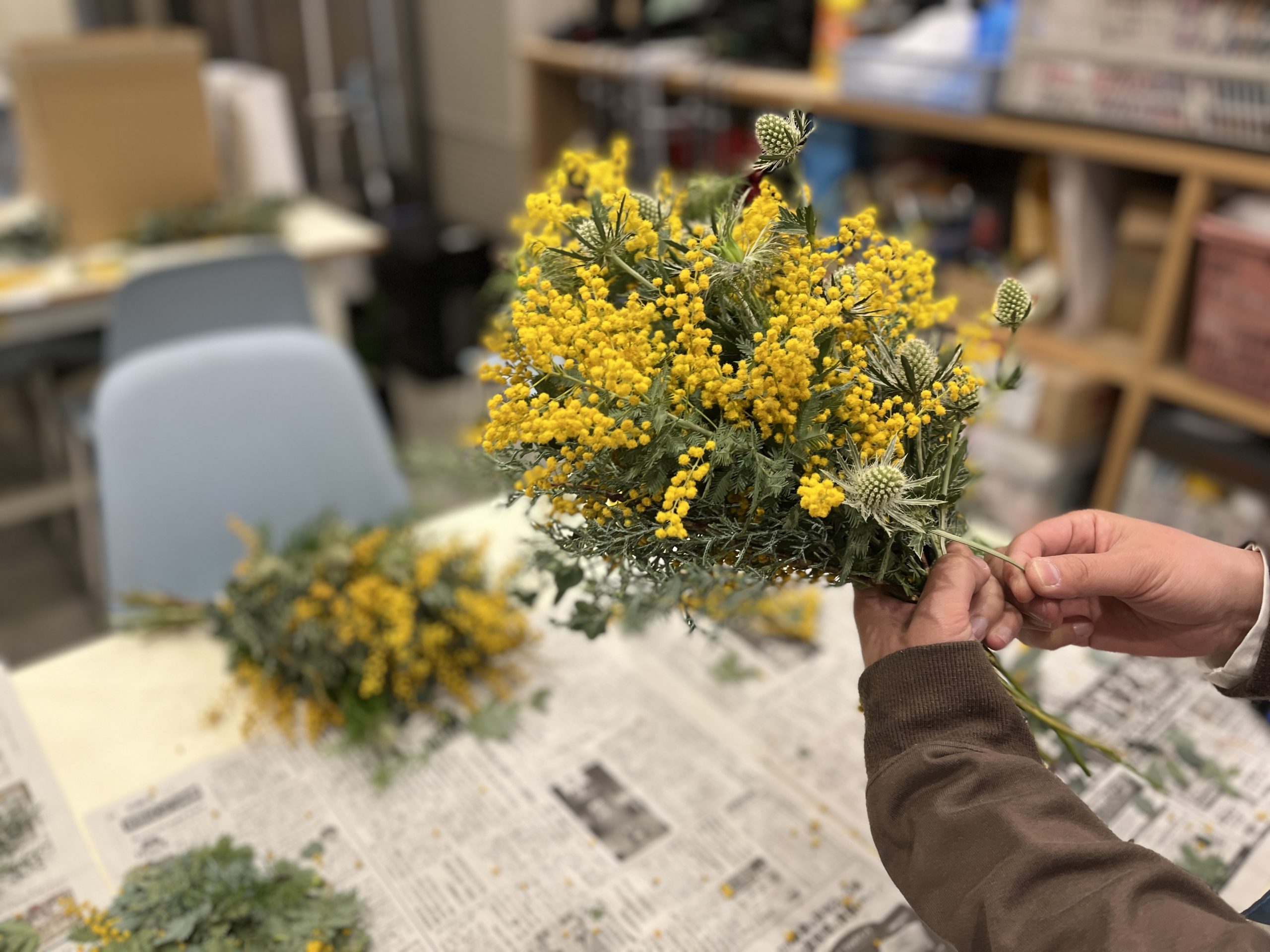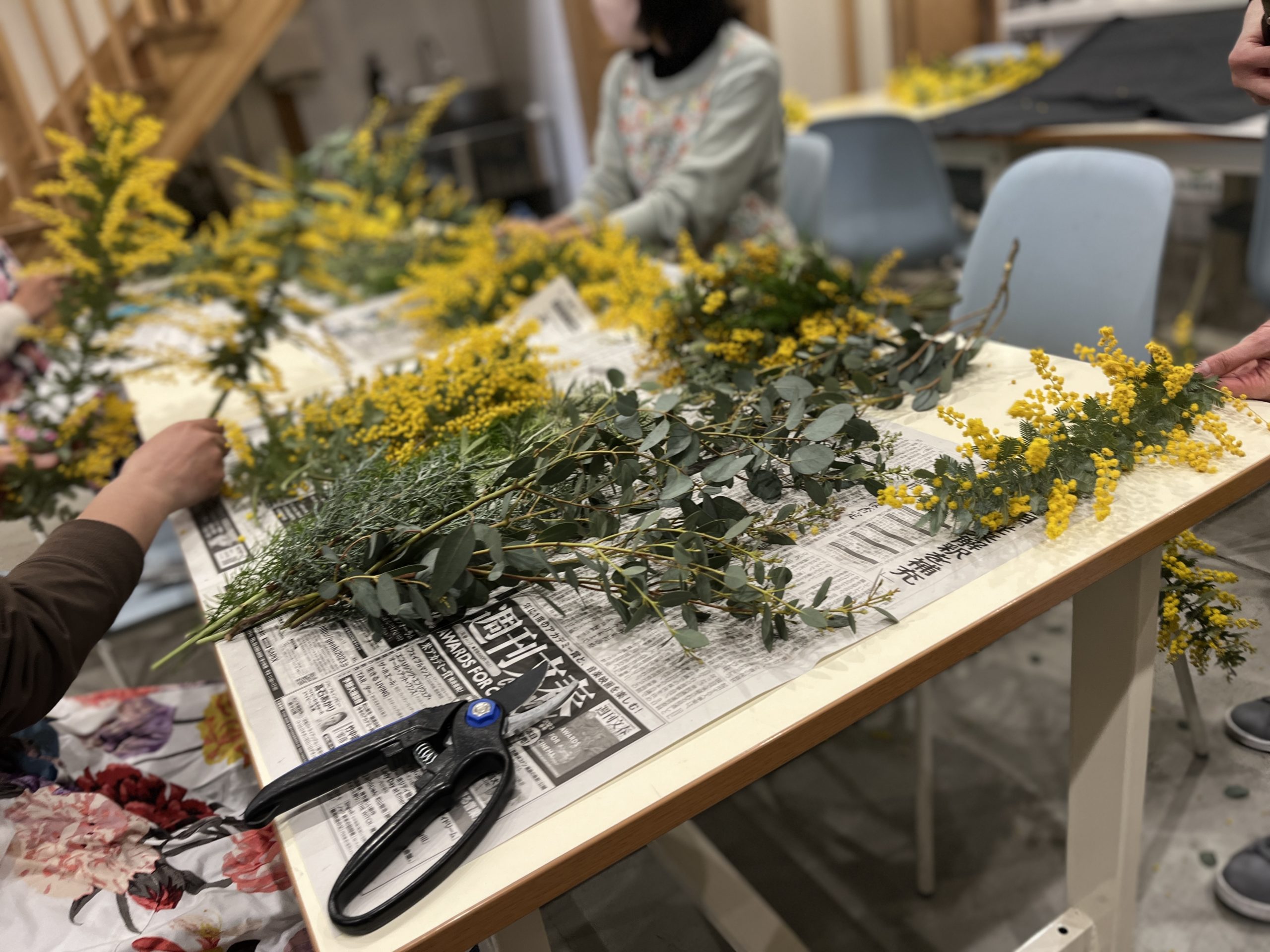 こんにちは(*^-^*) 3/17(金)古民家むくでは 幸せの花「ミモザ」を使った春のスワッグ作り を開催しました🌷 講師は内田さん✿ 今回久しぶりの開催になりました✨ イベント前からミモザの良い香りがしていました✨