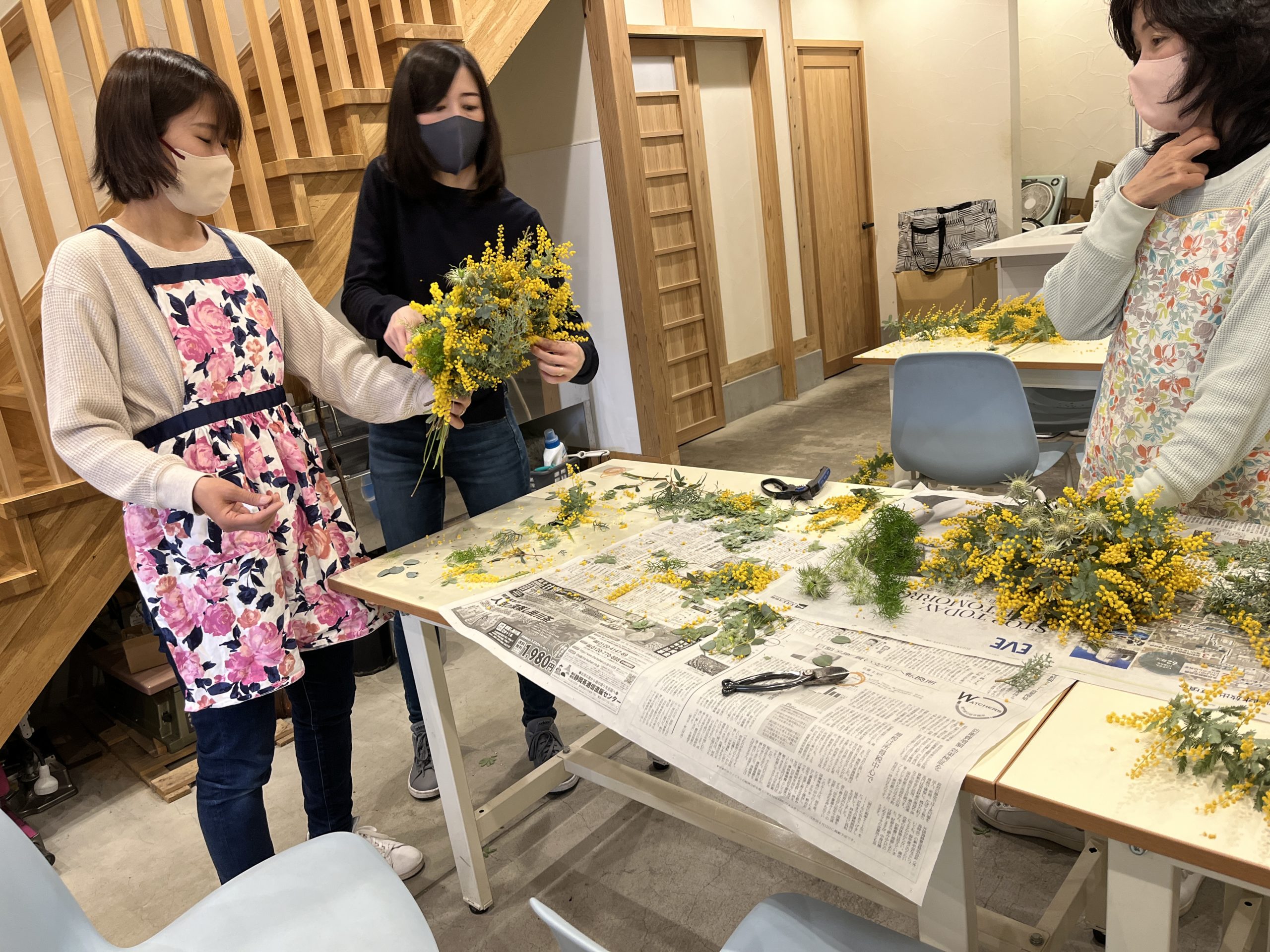 皆さんとっても素敵なスワッグが完成しました✨ 私も少しミモザをいただいて玄関に飾ってみましたよ(*^-^*) お花のある生活は気分も上がって良いですね♪ 次回の開催は未定ですが、また秋ごろ開催予定していますので お花好きな方は是非参加ください🌻