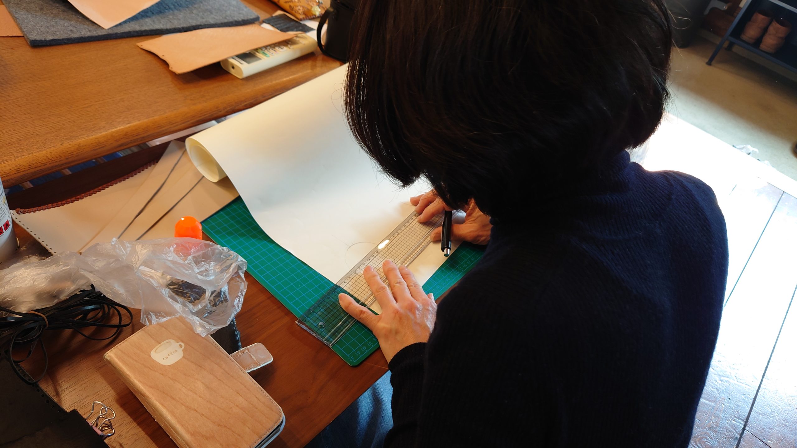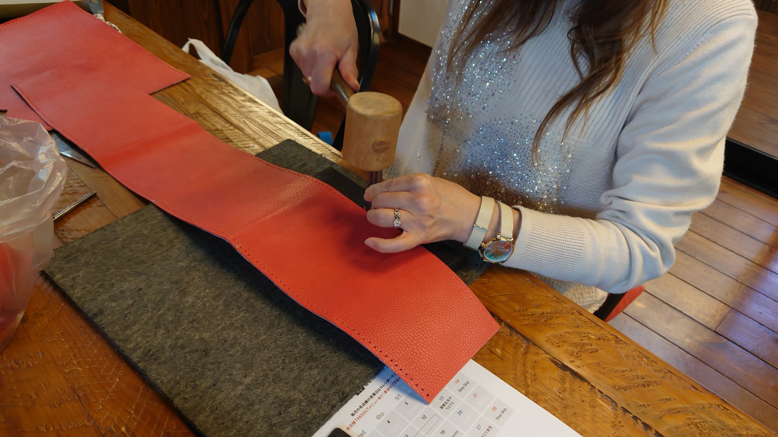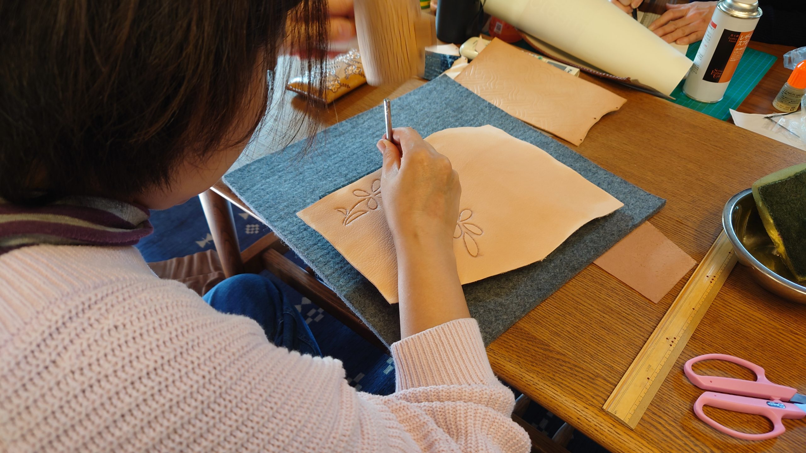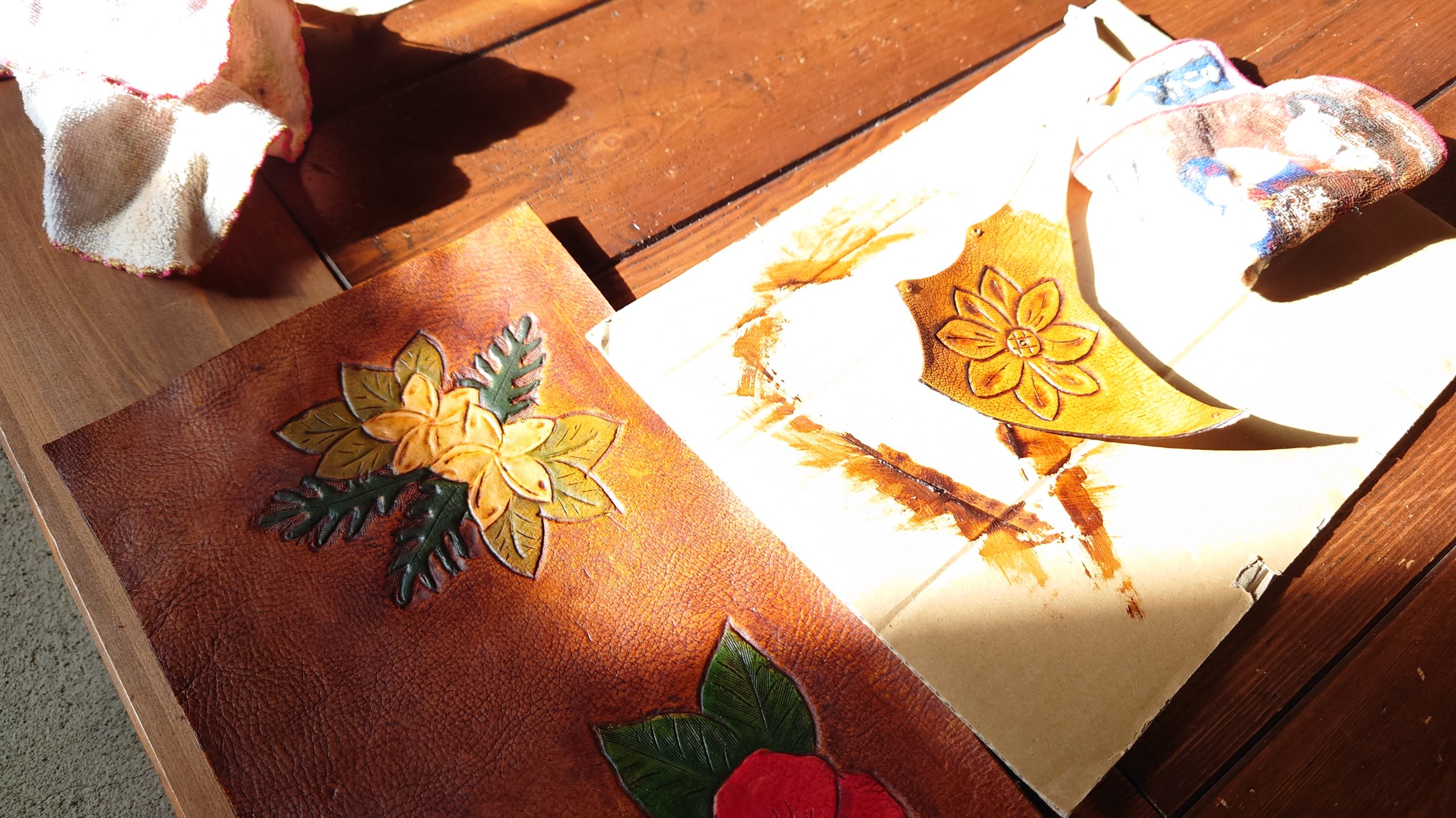 皮革生地を切ったり、模様をつけたり、染色したりと