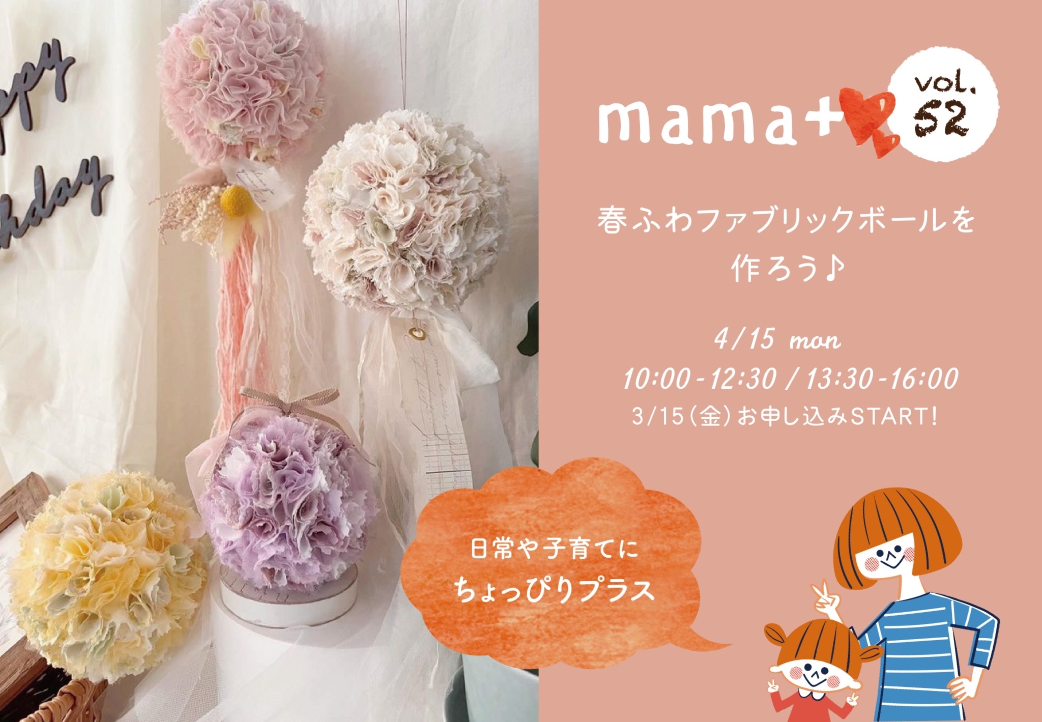 こんにちは🌸 今年は桜の開花がゆっくりでしたね🌸 皆さまお花見は出来ましたか? 今回のmama+は シムラスタジオ(旧古民家むくイベント棟)にて 春ふわファブリックボールを作ろう♪のイベントを開催いたしました!