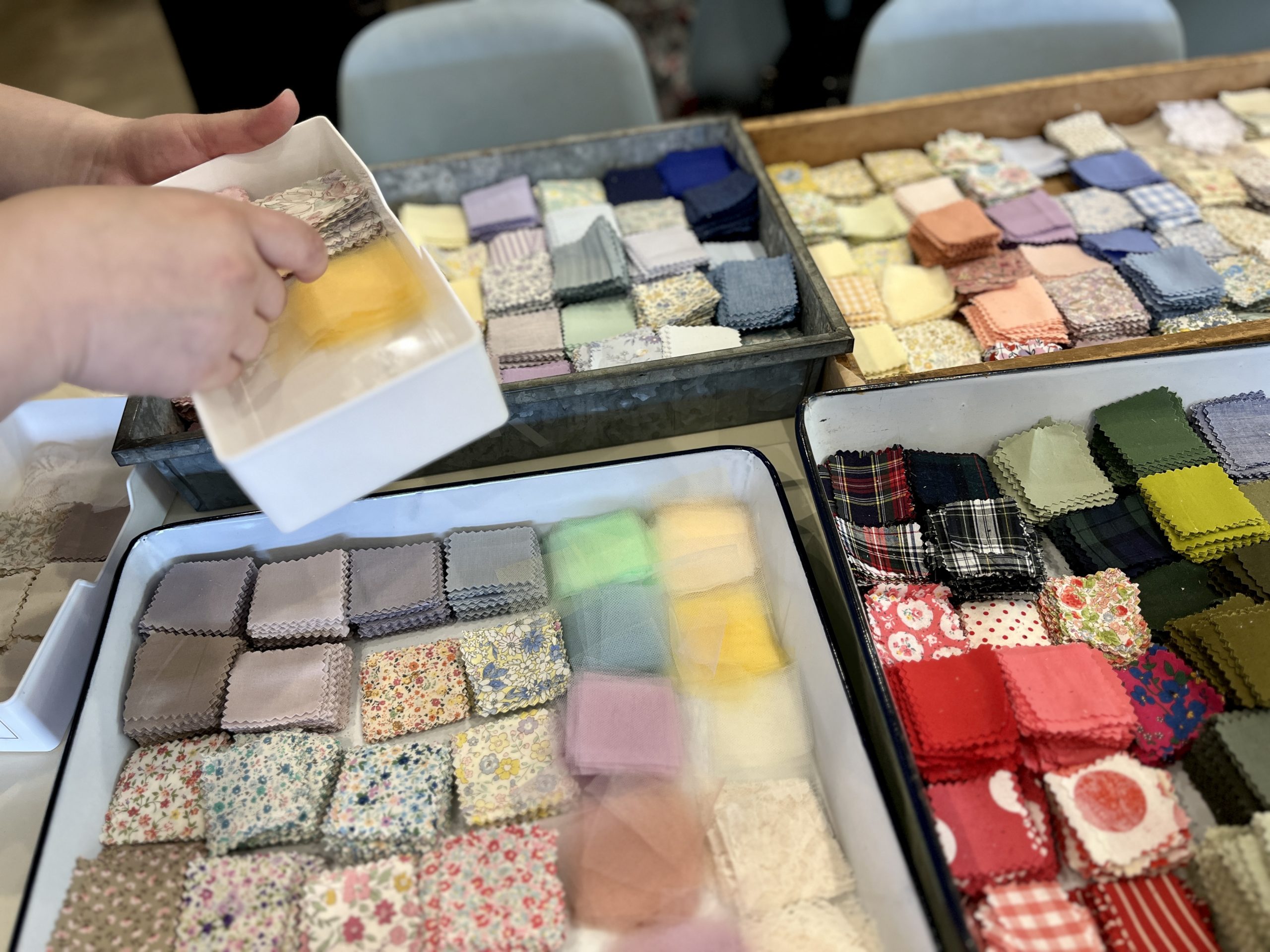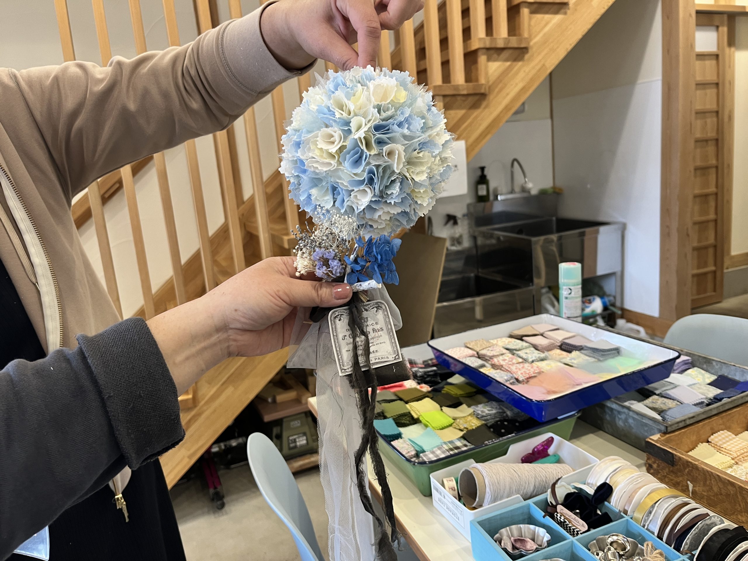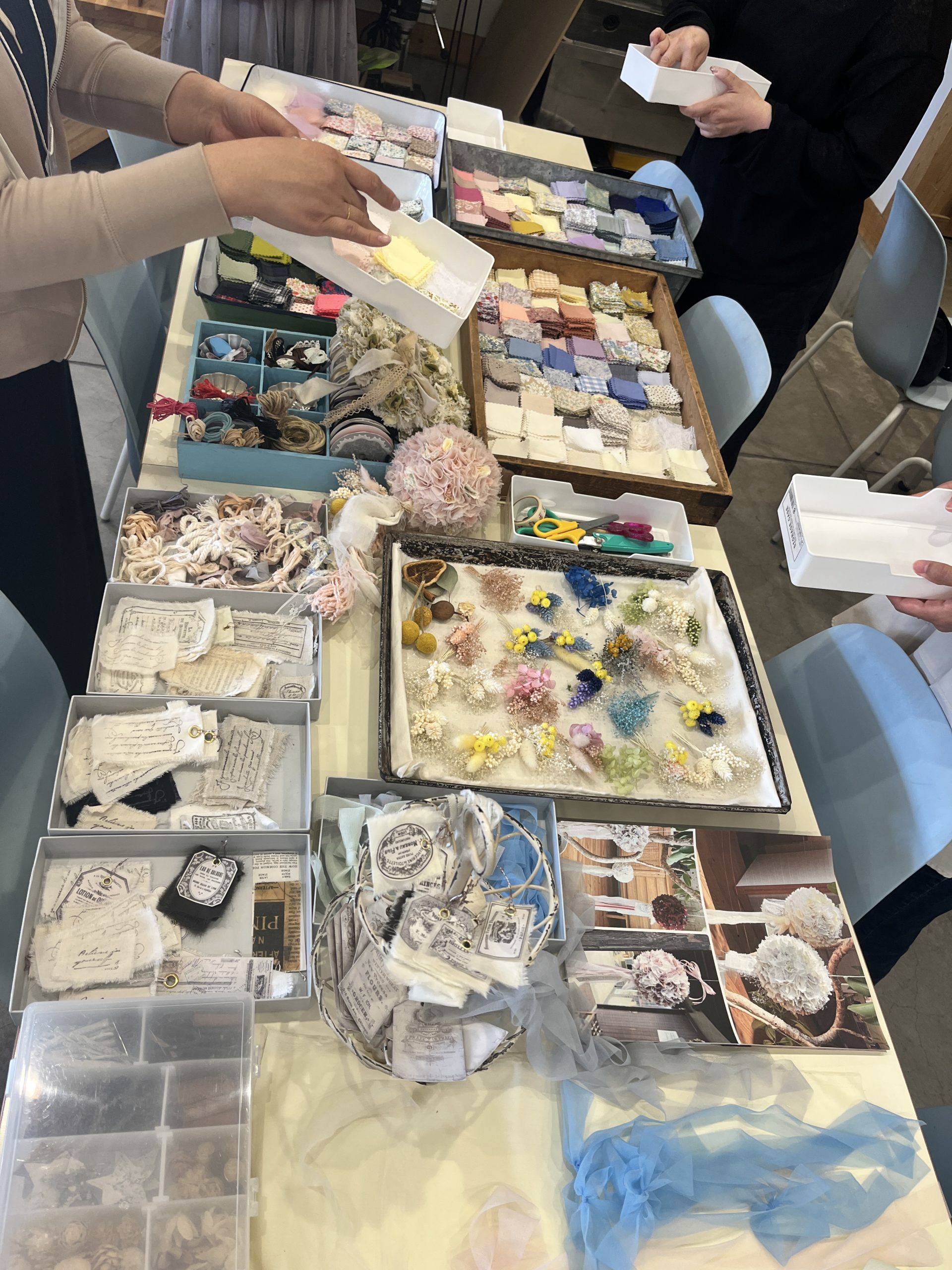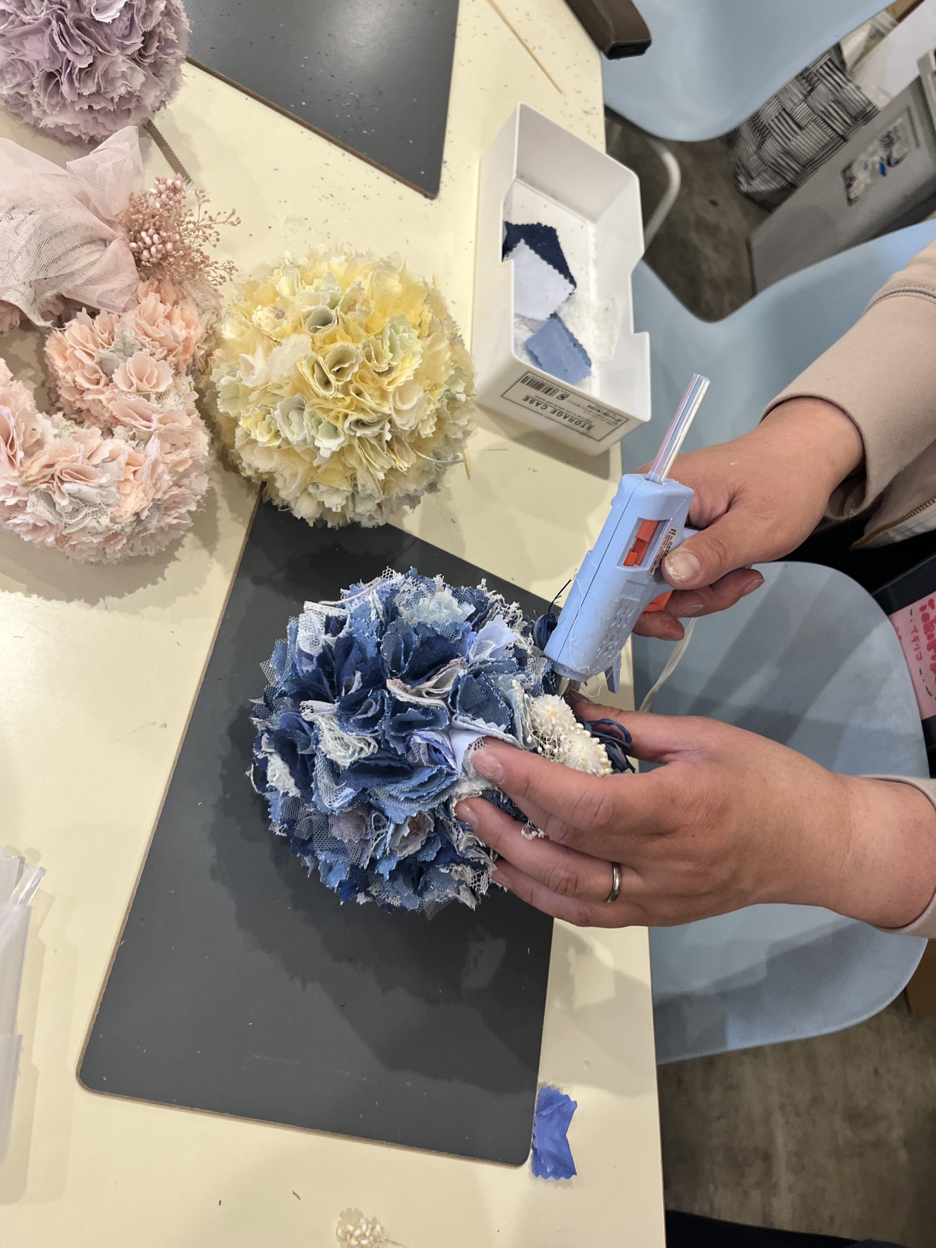 このワークショップの魅力のひとつは素材の種類の多さ✨ 色んな色の布や、リボンやドライフラワーなど沢山あって イメージしてきても違う色が気になってきたりして何個でも作りたくなってしまいます( *´艸`)