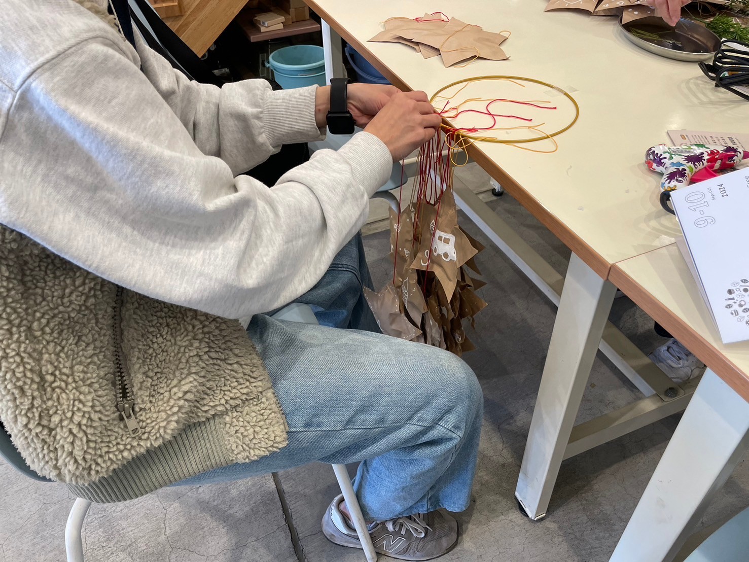 星形の袋の方に紐をつけてから、リングに取り付けていきます。