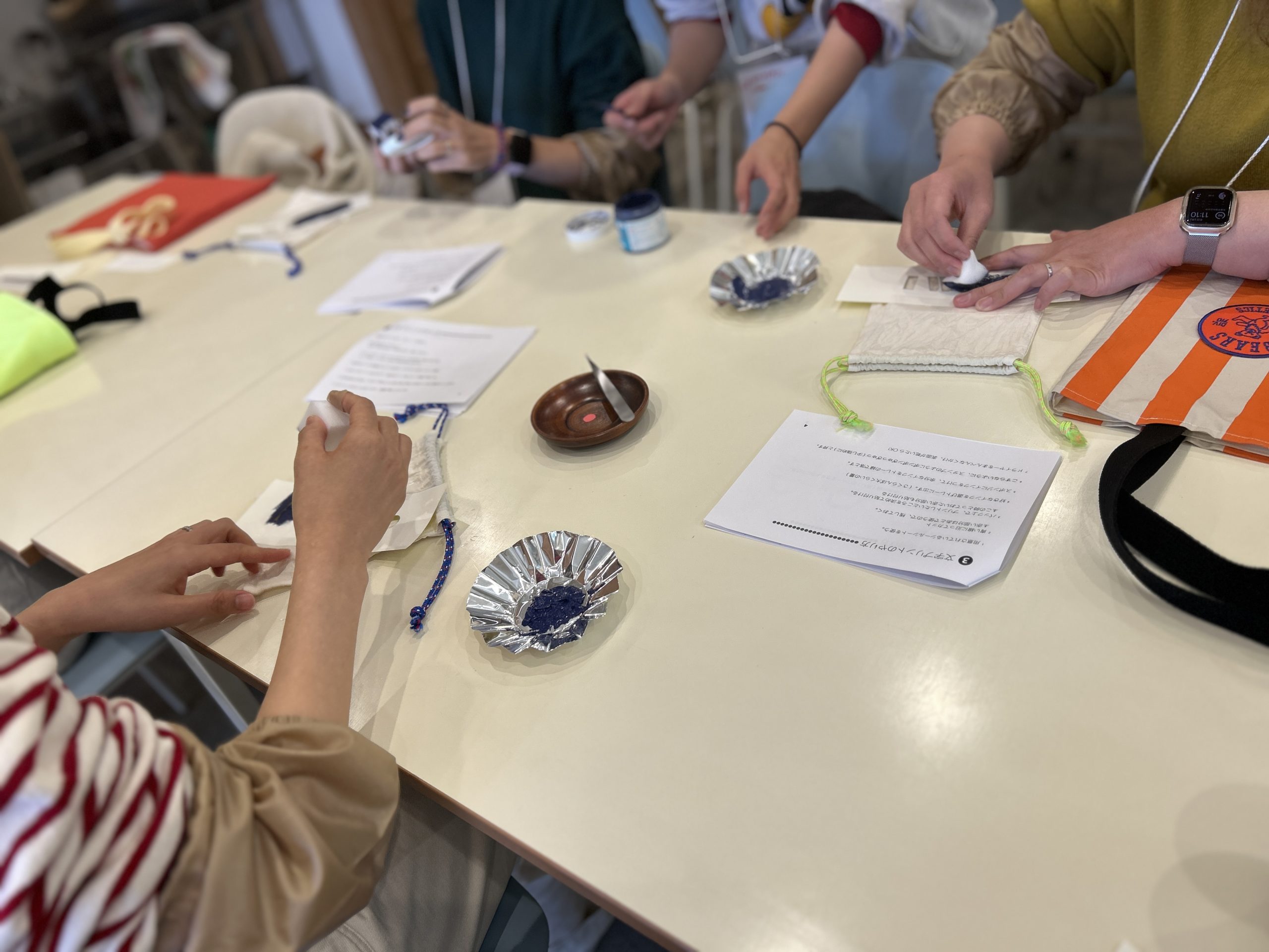 トートバッグにいきなりステンシルは心配なので、 まずは練習用に用意いただいたおまけの小さな巾着の方にステンシルしていきました。